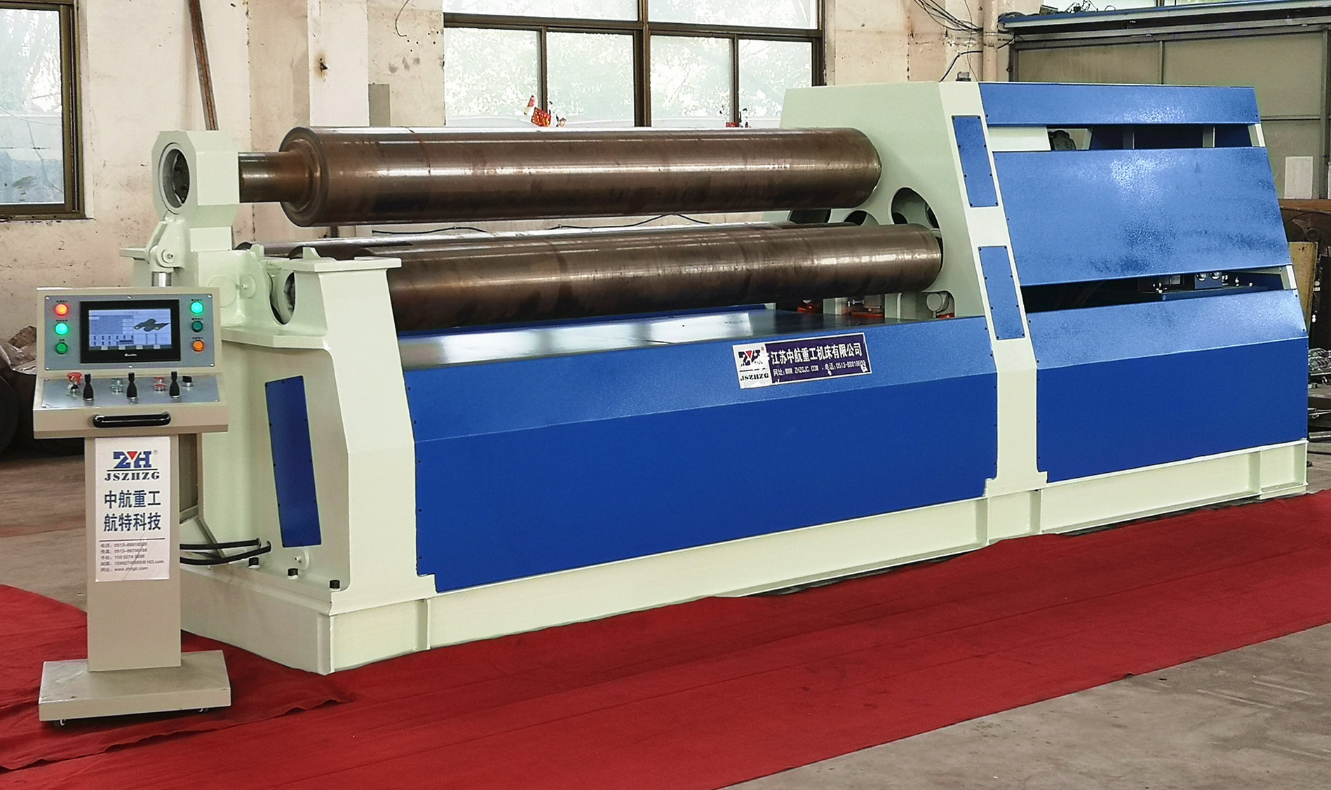 該機結構形式是四輥式,上輥為主傳動,通過減速機的輸出齒輪與上齒輪嚙合,為卷制板材提供扭矩;下輥做垂直升降運動,通過液壓缸內液壓油作用于活塞而獲得,以便夾緊板材,為液壓傳動;在下輥的兩側設有側輥并沿著機架導軌作傾運動,通過絲桿螺母蝸輪蝸桿或液壓傳動;該機優點是板材端部預彎及卷圓可以在同一臺設備上進行。